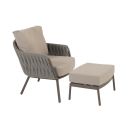 De Cannes loungestoel inclusief voetenbank is heerlijk comfortabel en ideaal om heerlijk in te ontspannen. De Cannes loungestoel heeft een prachtige afwerking van touw en is voorzien van all-weather kussens. Het frame van de loungestoel heeft de kleur terre. Het rope geeft de loungestoel een speelse uitstraling wat goed combineert met hout of aluminium.