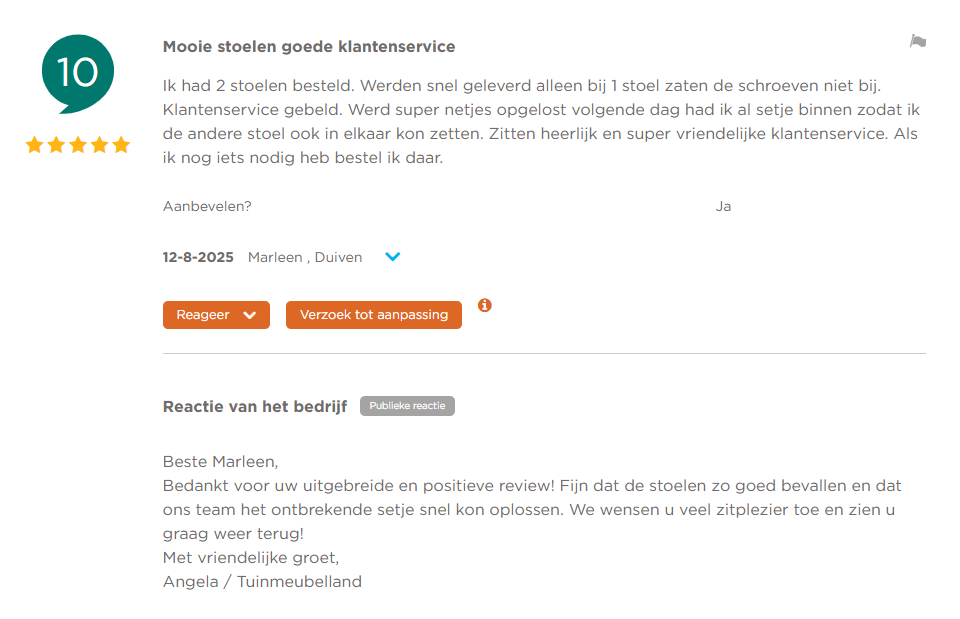 - Iedereen die dat wil kan ook een eenvoudige productreview plaatsen op de website van Tuinmeubelland. Deze worden wekelijks gecheckt op bijvoorbeeld taalgebruik en daarna live gezet. Deze manier van reviewen is niet via onafhankelijk platform, maar via een oude website module. Het gebruik hiervan is dan ook heel beperkt. We vinden het zonde om alle oude reviews weg te halen, daarom staan ze er nog. Zowel positieve als kritische reviews komen in beeld.