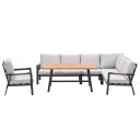 De Lissabon lounge dining set is vervaardigd uit een onderhoudsvrij en weerbestendig aluminium met een stevige poedercoating in een donker grijze kleur. De details hebben een teak look coating. Dit geeft de set een speels effect. De loungeset wordt geleverd inclusief dikke comfortabele valley zand kleurige kussens. De kussens bewerkt met een coating zodat het waterafstotend is. Het kussen is dus niet waterdicht en dient na gebruik opgeborgen te worden.