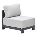 Het midden element is vervaardigd uit een onderhoudsvrij en weerbestendig aluminium frame met een stevige poedercoating. De rugleuning is voorzien van een teakhout look, maar is gewoon van aluminium. Dit geeft de loungeset een uniek uiterlijk. De meegeleverde kussens zijn gemaakt van hoogwaardig kwaliteit polyester. De kussens zijn niet waterbestendig en kunnen na gebruik worden opgeborgen in de schuur of kussenbox. Wel zijn de kussens voorzien van een waterafstotende coating. Dit is vooral erg praktisch als er bijvoorbeeld op het kussen wordt gemorst met drinken. Je veegt het vocht er namelijk gemakkelijk weer af.