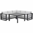 De lounge dining set is vervaardigd uit een onderhoudsvrij en weerbestendig aluminium frame met een stevige poedercoating. De meegeleverde kussens zijn gemaakt van hoogwaardig kwaliteit polyester. Het kussen is voorzien van een rits waardoor de hoes gemakkelijk met de hand kunnen worden gewassen. Het kussen is niet waterbestendig en kan na gebruik worden opgeborgen in de schuur of in een kussenbox. Wel is het kussen voorzien van een waterafstotende coating. Dit is vooral erg praktisch als er bijvoorbeeld op het kussen wordt gemorst met drinken. Je veegt het vocht er namelijk gemakkelijk weer af.