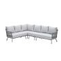 De Maud hoek loungeset is vervaardigd uit een stevig aluminium frame. Dit garandeert niet alleen een lange levensduur, maar zorgt ook voor een lichtgewicht set die eenvoudig te verplaatsen is. Bovendien is aluminium bestendig tegen alle weersomstandigheden, zodat de hoek loungeset het hele jaar door buiten kan blijven staan zonder zijn schoonheid te verliezen. De rugleuning is gemaakt van grey sand kleurig rope. Dit touw is te vergelijken met touw dat in de scheepsvaart gebruikt wordt. Het touw is voorzien van een rubberen kern binnenin met daarin meerdere polyester draden voor de stevigheid. Om de rubberen kern zit solution dyed polyester rope. Dit betekent dat het touw door en door gekleurd is en het verkleurt veel minder snel.
