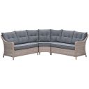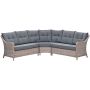 Wanneer je kiest voor de Nova hoek lounge diningset dan is de samenstelling als volgt: twee open bank delen (linker en rechter bank), en een rond hoekelement. De loungebanken zijn gemakkelijk aan elkaar te bevestigen door de meegeleverde clips. Zo blijven de banken goed tegen elkaar aan staan.