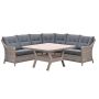 Wanneer je kiest voor de Nova lounge dining set dan is de samenstelling als volgt: twee open bank delen (linker en rechter bank), een rond hoekelement en een hoge tafel. De loungebanken zijn gemakkelijk aan elkaar te bevestigen door de meegeleverde clips. Zo blijven de banken goed tegen elkaar aan staan.
