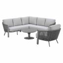 De Ryan loungeset bestaat uit twee bankdelen, een hoekelement en een loungetafels. De loungeset is nog verder uit te breiden met een loungestoel, middenelement of een voetenbank. Mocht je meer tafelruimte nodig hebben is het ook mogelijk om nog een bijzettafel bij de loungeset te combineren.