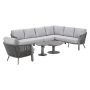 De Ryan loungeset bestaat uit twee bankdelen, een hoekelement, een middenelement, een loungestoel en twee loungetafels. De loungeset is nog verder uit te breiden met een loungestoel, middenelement of een voetenbank. Mocht je meer tafelruimte nodig hebben is het ook mogelijk om nog een bijzettafel bij de loungeset te combineren.