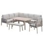 De San Capri lounge dining set 7-delig is een strakke aluminium loungeset met een coating in de kleur: light oak look. De lounge dining set wordt geleverd met comfortabele lounge kussens. De leuningen zijn voorzien van een detail van gevlochten rope. Een prachtige lounge dining set om te zien. In deze set kun jij heerlijk ontspannen, maar ook dineren met jouw familie of vrienden.