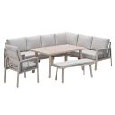 De San Capri lounge dining set 7-delig is een strakke aluminium loungeset met een coating die zorgt voor een light oak look. De lounge dining set wordt geleverd met comfortabele lounge kussens. De leuningen zijn voorzien van een detail van gevlochten rope. Een prachtige lounge dining set om te zien. In deze set kun jij heerlijk ontspannen, maar ook dineren met jouw familie of vrienden.
