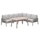 De San Capri lounge dining set 5-delig is een strakke aluminium loungeset met een coating die zorgt voor een light oak look. De lounge dining set wordt geleverd met comfortabele lounge kussens. De leuningen zijn voorzien van een detail van gevlochten rope. Een prachtige lounge dining set om te zien. Deze lounge dining set is zowel als linker- en rechteropstelling op te stellen.
