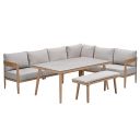 De San Mauro lounge dining set met gobi sand kussens is een mooie ruimte lounge dining set voor de tuin. Deze lounge dining set is vervaardigd uit een onderhoudsvrij en weerbestendig aluminium met een stevige poedercoating in een light teak look kleur.