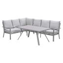 De Senja lounge dining set is vervaardigd uit een onderhoudsvrij en weerbestendig aluminium met een stevige taupe kleurige poedercoating. Aluminium heeft als voordeel dat het onderhoudsvrij is. Wanneer de set vies is geworden door bijvoorbeeld opspattend regenwater kan je dit eenvoudig schoonmaken met een sopje van groene zeep en een zachte doek. Ideaal! De lounge dining set is uit te breiden met een lounge dining stoel en een sportbankje. De tafel heeft een latten structuur en brede platte tafelpoten, hierdoor heeft de tafel een strak design. De lounge dining set is voorzien van verstelbare pootdopjes, hierdoor is deze makkelijk waterpas te zetten.