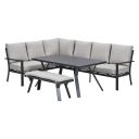 De Senja lounge dining set is vervaardigd uit een onderhoudsvrij en weerbestendig aluminium met een stevige donker grijze poedercoating. Aluminium heeft als voordeel dat het onderhoudsvrij is, wanneer de set vies is geworden door bijvoorbeeld opspattend regenwater kan je dit eenvoudig schoonmaken met een sopje van groene zeep en een zachte doek. Ideaal! De lounge dining set is uit te breiden met een lounge dining stoel en een sportbankje. De tafel heeft een latten structuur en brede platte tafelpoten, hierdoor heeft de tafel een strak design. De lounge dining set is voorzien van verstelbare pootdopjes, hierdoor is deze makkelijk waterpas te zetten.