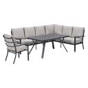 De Senja lounge dining set 4-delig rechts is een prachtige aluminium lounge dining set met stevige kussens en een hoge rugleuning. Hierdoor heb je het ultieme comfort en kan je heerlijk ontspannen. Naast het loungen is de lounge dining set ook geschikt om heerlijk aan te tafelen. De Senja lounge dining set van kwaliteitsmerk Garden Impressions past in iedere moderne tuin.