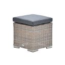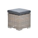 Het krukje is voorzien van een aluminium binnen frame met daaromheen hand gevlochten 6 mm half rond kunststof wicker draad. Het krukje wordt geleverd met een praktisch texfiber all-weather kussen welke is voorzien van een stevige comfortabele sneldrogende vulling. Het kussen kan gerust buiten blijven liggen bij een regenbuitje en is binnen ongeveer twee uur weer droog. Uiteraard kan het kussen wel smerig worden, maar gemakkelijk maak je deze ook weer schoon met een zacht sopje.